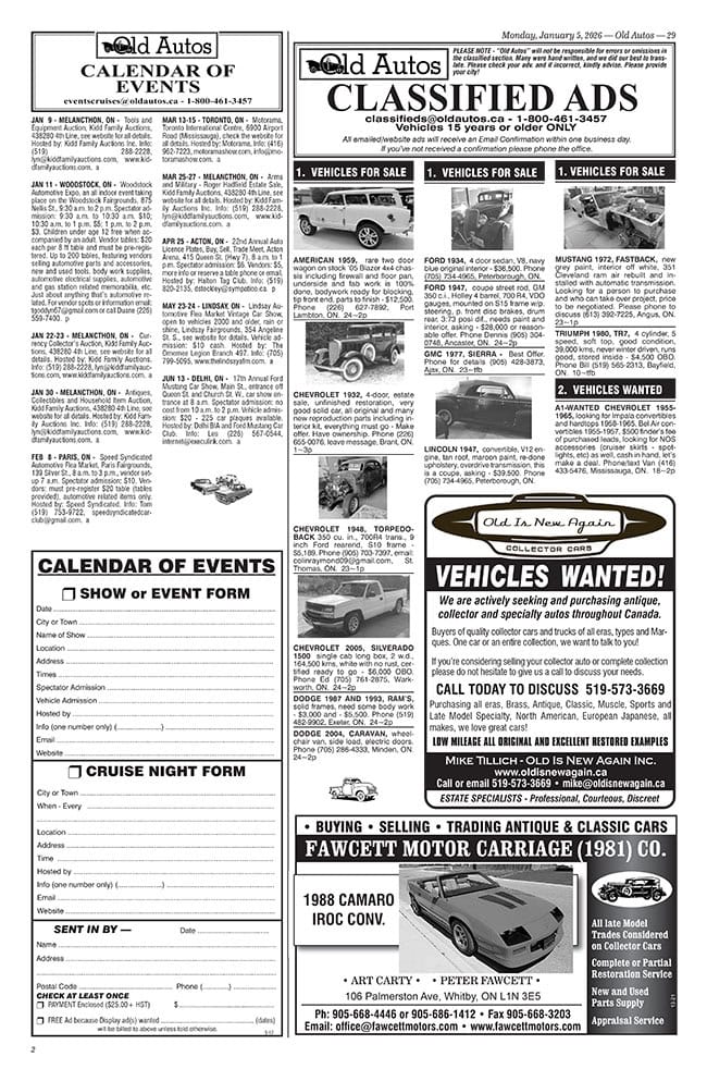 MAIL – OLD AUTOS, PO Box 250 Bothwell ON N0P 1C0
